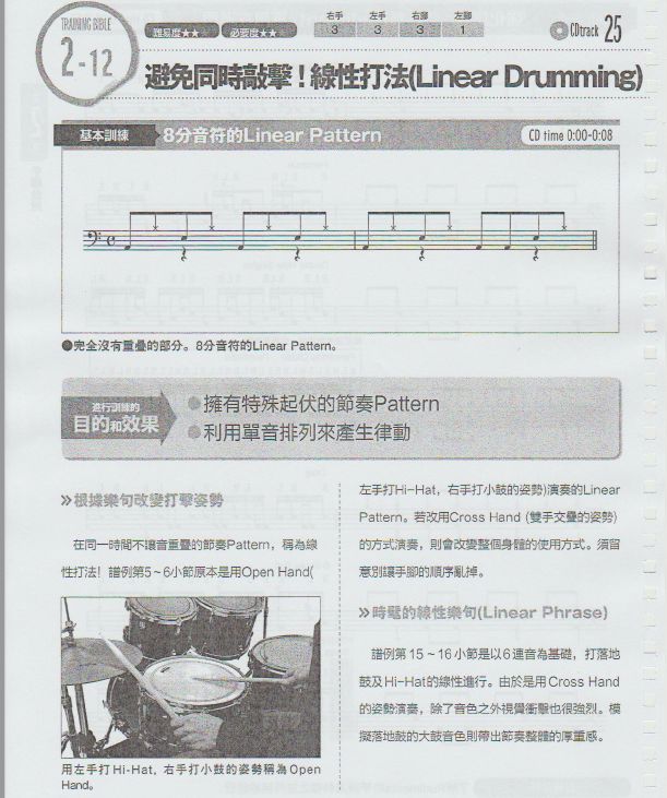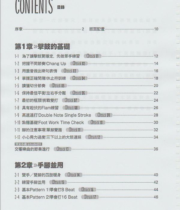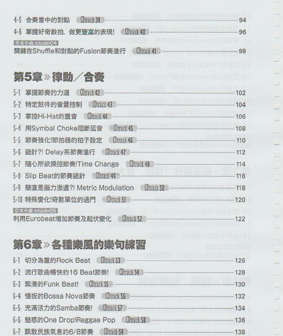 另外,谱例上提示的演奏速度仅仅供参考,觉得打来轻松的人可以试着加快,觉得太快的人则可以稍微放慢,如此依自己的能力做适当调整,会让练习更具效率。只要用心看完整本书、熟辕所有谱例,相信你也能随心所欲驾驭爵士鼓这项乐器。