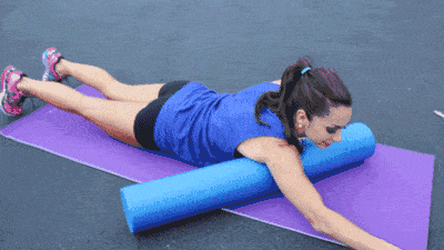 趴在泡沫轴上,用腿部发力带动身体,将泡沫轴从胸前向腋下滚动