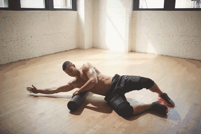 侧躺将泡沫轴放于身下,在侧腹和腋窝之间滚动