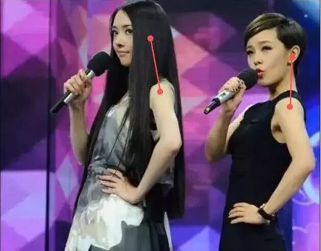 除此之外,圆肩都会伴随着脖子前倾,正常来说耳朵和肩膀应该是在一条直线上,当年郭女神上快本的跟郭采洁的合影,就比较出来了。