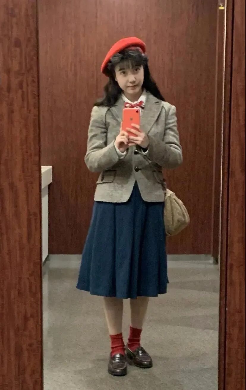 不过,除了复古长裙之外,膝盖处的中长裙在当时也蛮流行的,搭配一件中长同色系的立领衬衫再加一顶贝雷帽,少女漫画气息扑面而来。