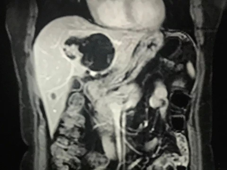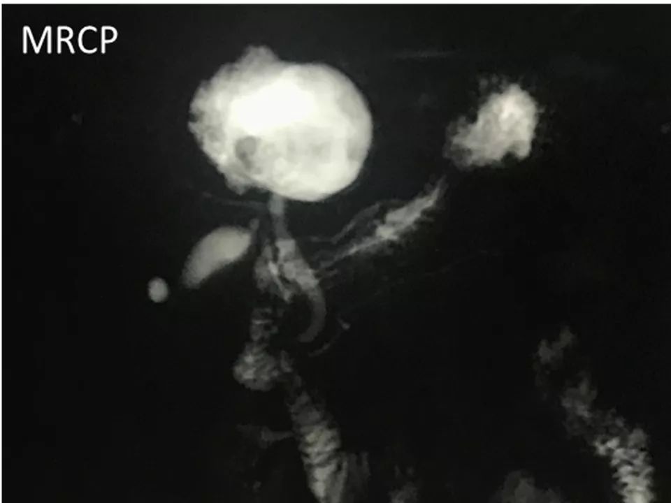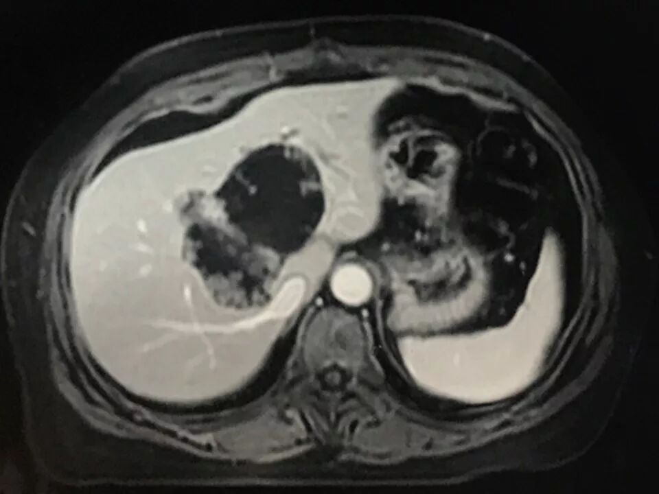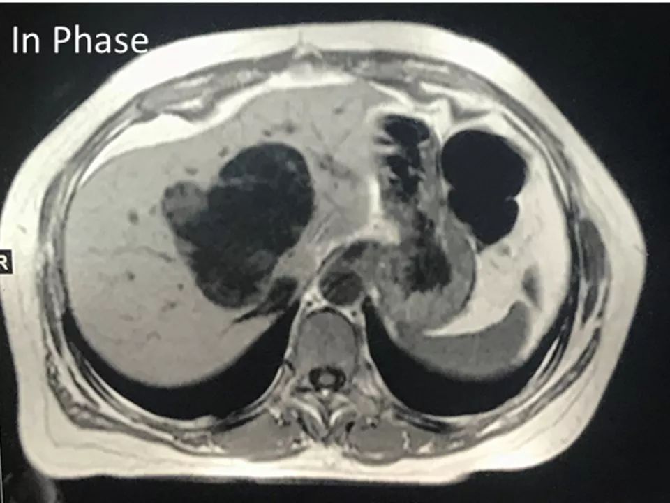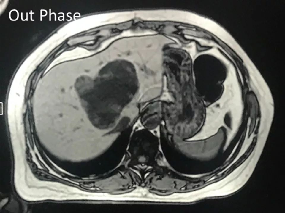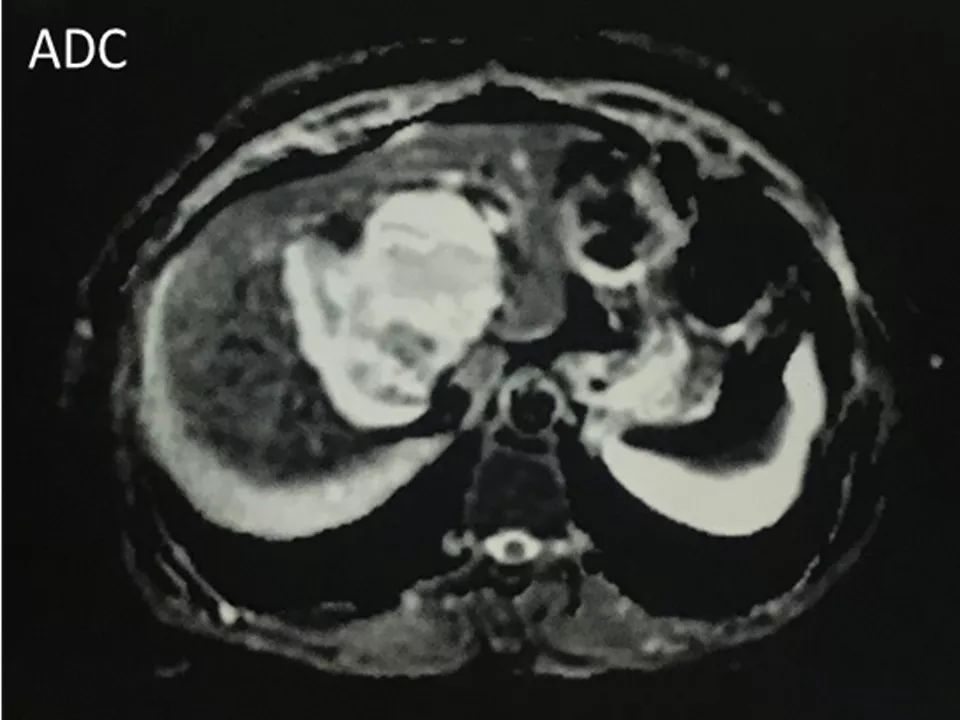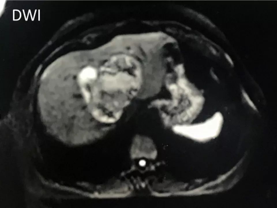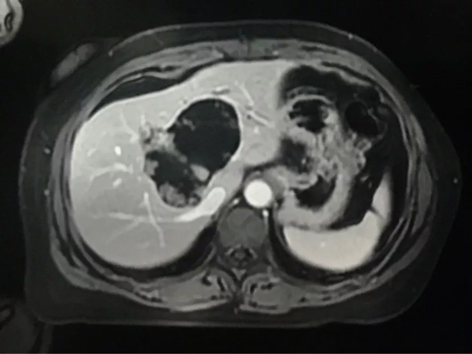 肝内单发占位灶,累及肝左右叶及尾叶。T1WI示病灶以低信号为主,边缘多枚等信号结节,正反相位未见明显脂肪成份;T2WI示病灶以粘液成份为主呈高信号,边缘多枚稍高信号结节(相对肝实质),DWI呈不均匀等高信号,ADC图以高信号为主。动脉期病灶边缘均匀强化,壁结节显著强化,门脉期边缘仍持续强化,边缘光滑,壁结节呈相对等低信号。MRCP示胆管扩张,病灶与胆管相通。