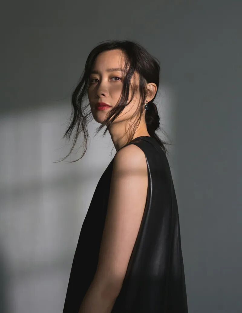 黑色的马甲式连衣裙低调大气,陈法拉内搭了白色的圆领打底衫,简洁又富有文艺范儿。