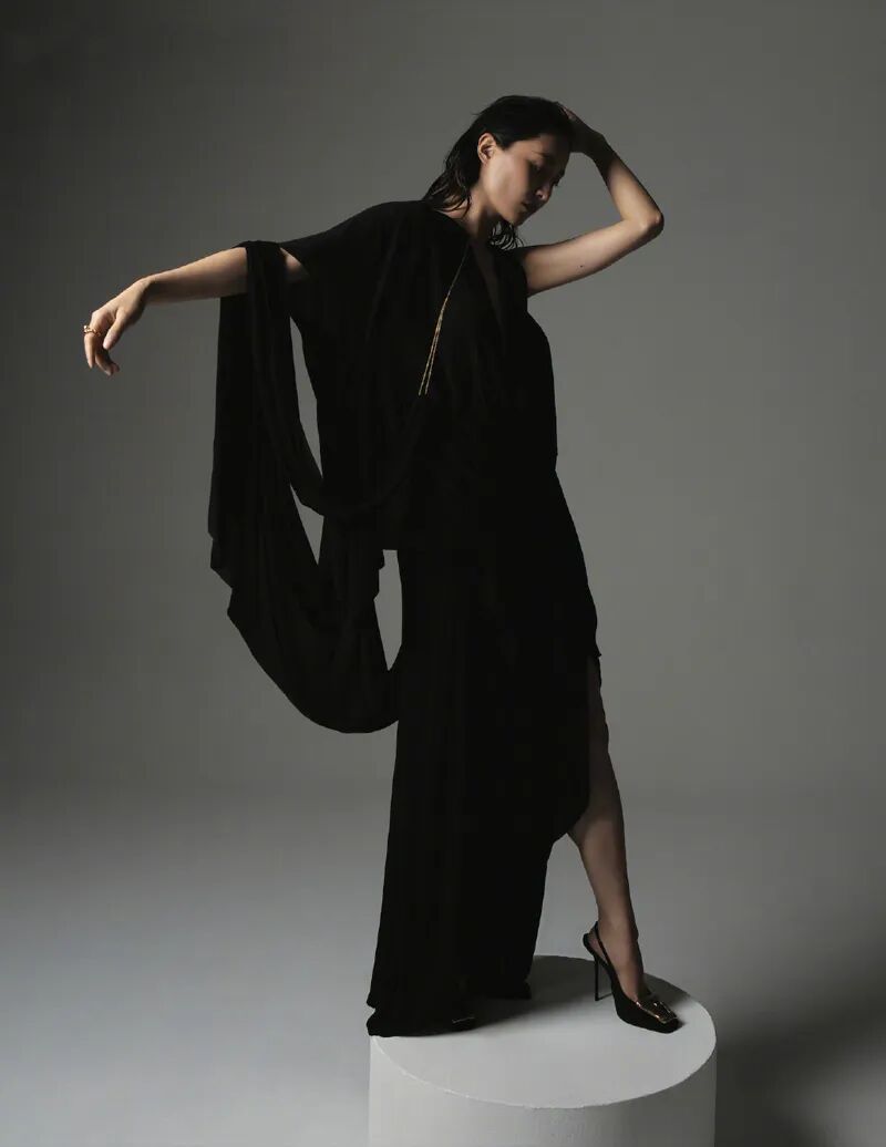 这款黑色的连衣裙设计感十足,衣身好像是不同的绑带组合起来,领口用金链子链接,将现代前卫的时尚元素融入其中。脚上搭配也是黑色的高跟鞋,完美展示人体和服饰的美感。