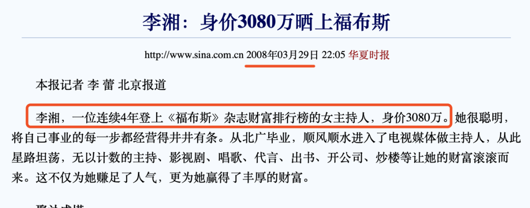 早在2008年,就有媒体报道李湘连续4年登上《福布斯》杂志财富排行榜,身价3080万。还列举了李湘的几大收入来源,包括主持年薪、走场演出、广告代言,还有房产投资的巨额回报。
