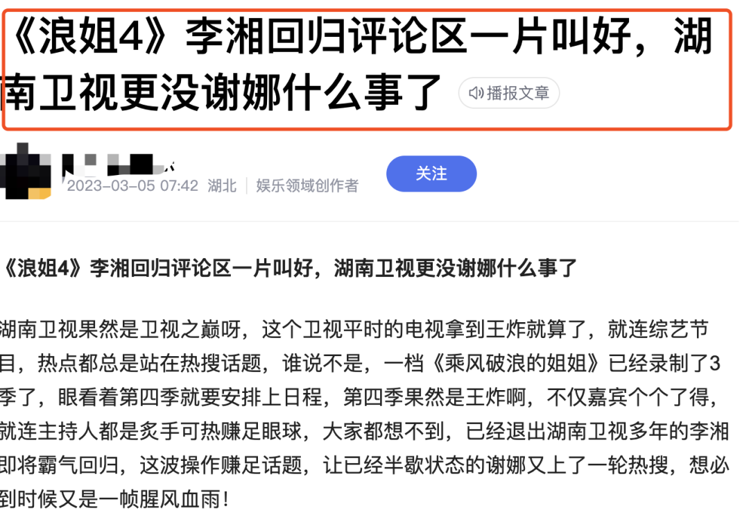 比如,李湘和谢娜旷日持久的“湖南卫视一姐”之争。其实谢娜只担任了一届《浪姐》的发布人,但还是难免被拿来对比,揶揄业务能力。