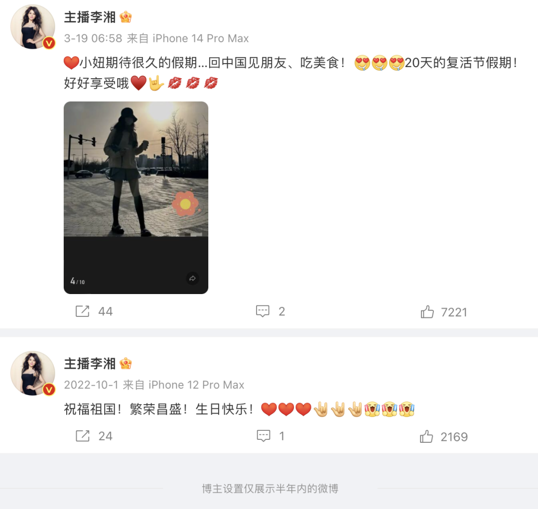 从前热衷于分享生活的李湘,去年就把微博动态设置了半年可见。在抖音发布的内容几乎都是在英国陪读女儿的日常。