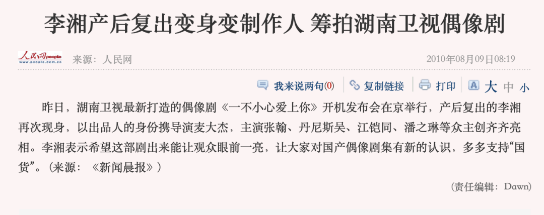 说回正题,李湘出走湖南台之后,先是去到更自由的华娱卫视独立制作节目,后来又创业开影视公司。翻拍自《蓝色生死恋》的连续剧《一不小心爱上你》,就是由李湘出品和监制的。