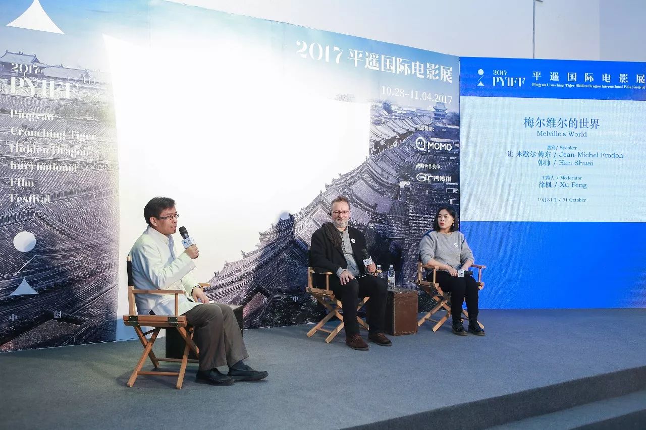 10月31日,首届平遥国际电影展进入第四天,“梅尔维尔的世界”主题论坛火爆电影宫。本次论坛嘉宾均为电影学界知名人物:法国电影专家、中戏教授徐枫担任主持,法国著名影评人、《电影手册》前主编让-米歇尔·傅东以及中国新锐导演、梅尔维尔研究者韩帅作为嘉宾共同出席,重量级嘉宾吸引了大批观众前往。