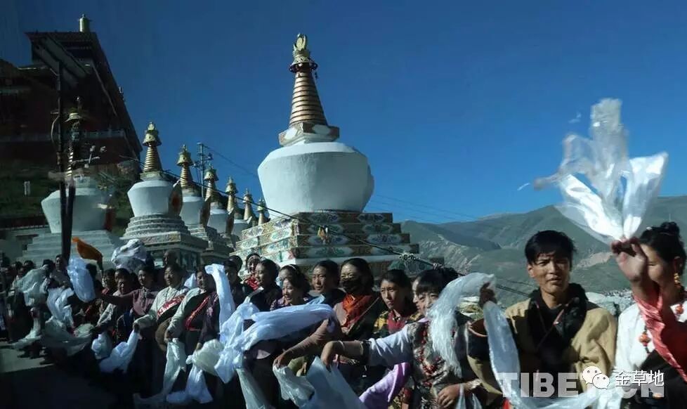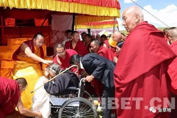 在贡萨寺前的扎西滩草原为信教群众摸顶赐福,并前往治多县城的幸福敬老院为老人们举行慈善活动和讲经摸顶。
