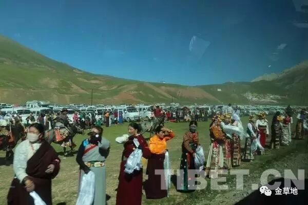 当地僧俗群众沿路站开,人们穿着锦缎藏装,带着豪华昂贵的藏饰,手捧哈达迎接班禅大师的到来。迎接班禅大师的还有道路两旁的各种汽车。在各族群众、僧尼、歌舞、马队、牦牛队、车队的热烈欢迎中,班禅大师一行来到贡萨寺。