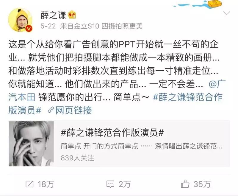 而锋范之所以能让薛之谦如此认真对待,归根到底也是因为广汽本田在与薛之谦的合作过程中,同样认真的态度。毕竟尊重是相互的。看薛之谦5月22日的那条微博便知道了——“这是个从给你看广告创意的PPT开始就一丝不苟的企业”,这就是你们老公谦谦对广本的评价。