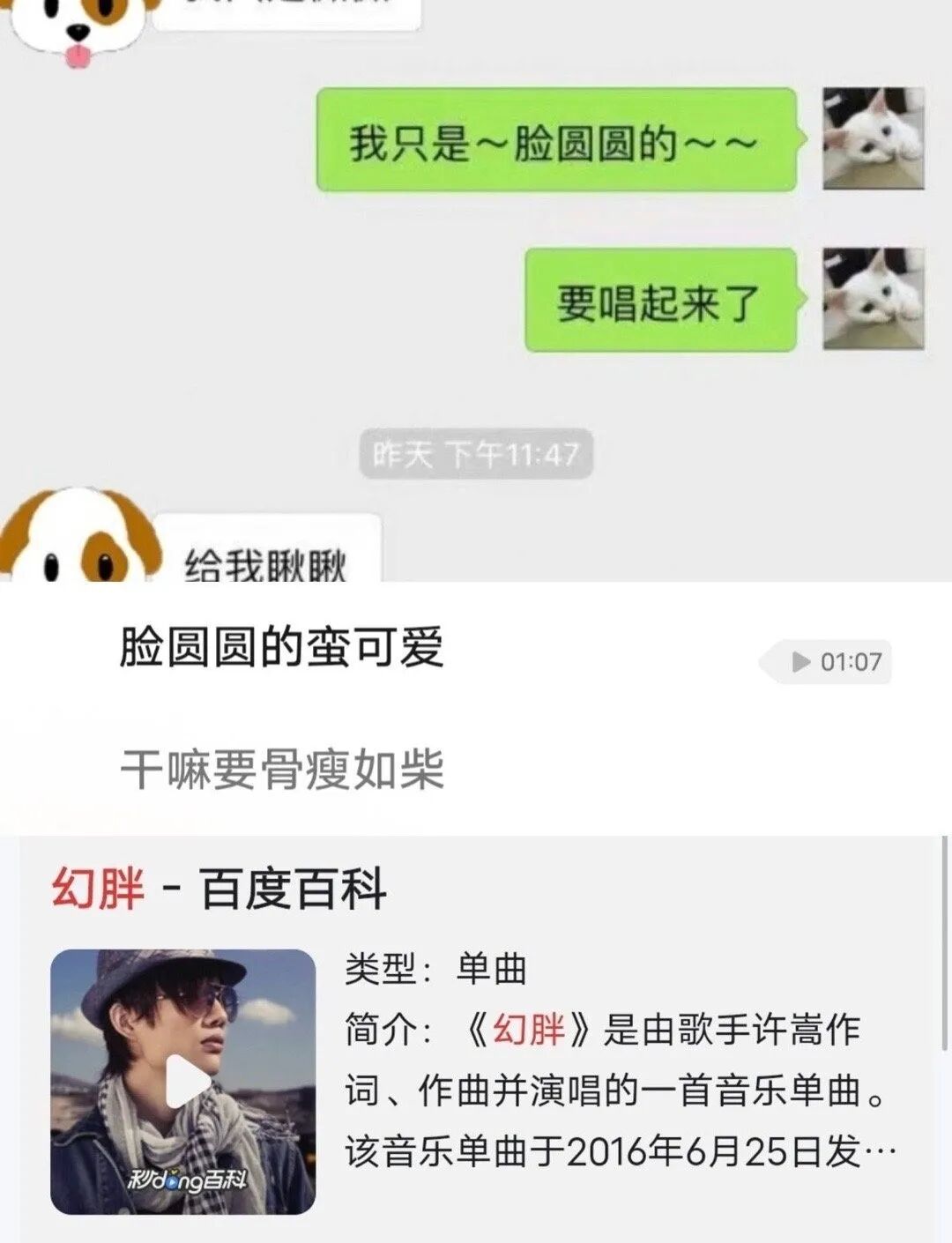 另一个“脸圆圆的,要唱起来了”,对应的是许嵩《幻胖》的歌词: