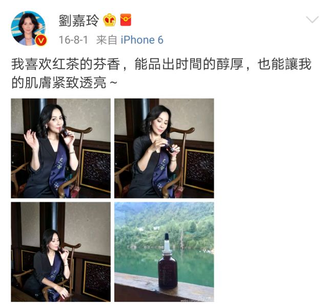 ▲刘嘉玲微博晒出的红茶护肤品,让皮肤紧致透亮。