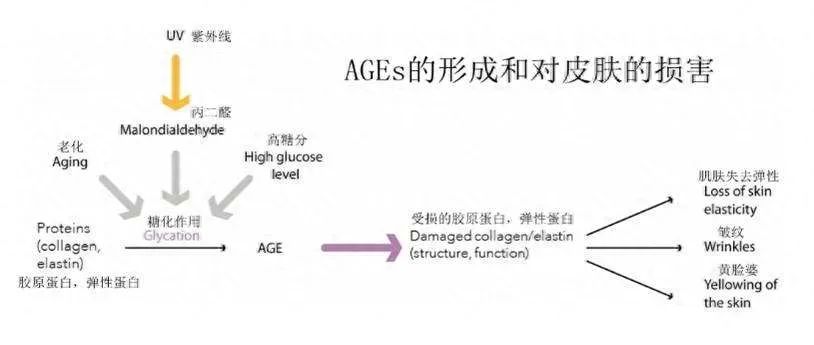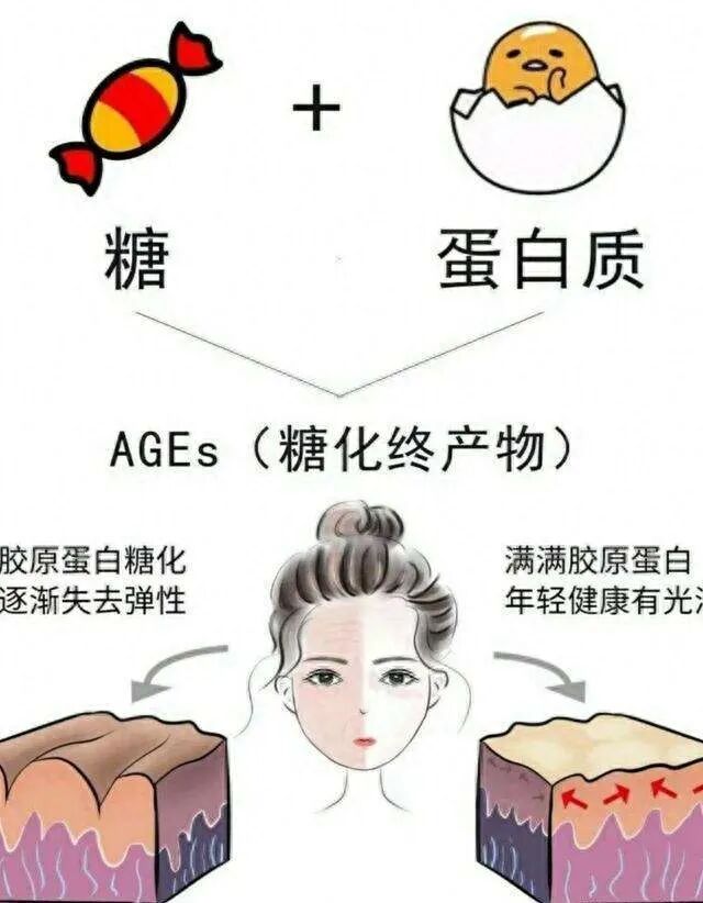 人体内的“糖化反应”可以理解为降温后的美拉德反应,是法国化学家美拉德在1912年发现甘氨酸与葡萄糖混合加热时会形成褐色的物质。真皮层内的胶原蛋白被糖化后,胶原质纤维的弹性下降,会导致皮肤松弛;过多的糖分使雄性激素增高,皮脂分泌增加,可能会形成痤疮;同时,糖会使酪氨酸酶变得更活跃,进而增加黑色素的生成。