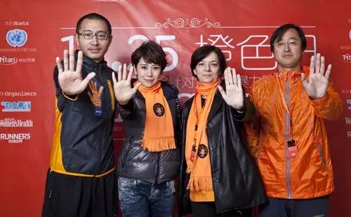 ▲(从左至右)于嘉、海清、Julie Broussard、张路平做出反对暴力手势