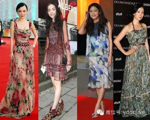 雪纺的飘逸浪漫把女性的温柔突显出来,而印花则加强了这样的印象。霍思燕用裸粉色点缀红色花朵的曳地印花裙完成妩媚女人味的形象;超模孙菲菲则用暗红色短摆雪纺连衣裙打造春夏的轻松感觉;徐静蕾的蓝色印花裙看上去成熟大气,历练的端庄体现了出来;陶虹的印花雪纺长裙度假感十足,但整体颜色偏暗,如果能稍微明媚些,效果会更好。