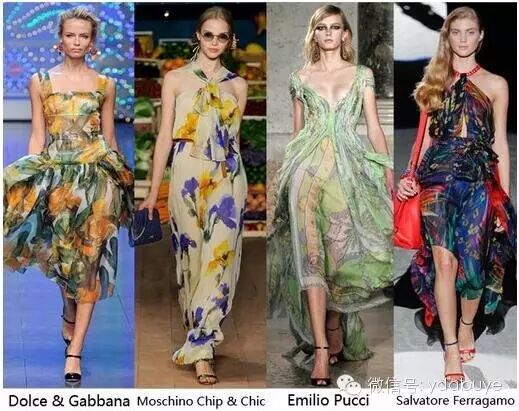以充满意大利风情的西西里菜市场为灵感,Dolce & Gabbana把蔬果图案印上飘逸的雪纺上,充满了清新的味道;无独有偶,Moschino Cheap & Chic以水果摊作为本季的灵感来源,花卉水果遍布的长裙烘托了浓厚的度假情怀;Emilio Pucci用艺术感十足的花纹连缀成丝巾质感的飘逸长裙,突出了女性温柔却自我的独特气质;SalvatoreFerragamo的红蓝相间的长裙打造了异域风情。