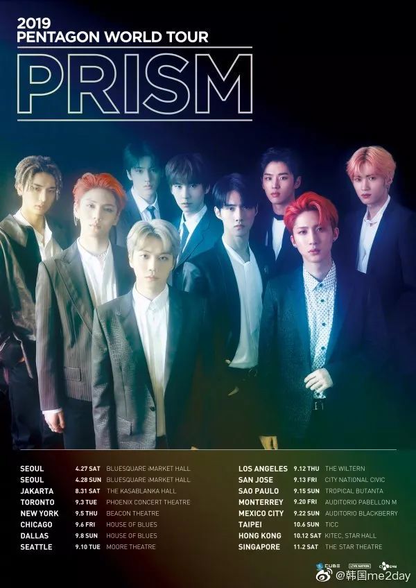 韩国时间2日0时,PENTAGON通过官方SNS发布预告海报,公开了即将进行首次“2019 PENTAGON WORLD TOUR PRISM”世界巡回演唱会的消息。据悉,组合将于8月31日开始在雅加达-多伦多-纽约-芝加哥等全球15个国家和地区举办共16场演出,并与当地粉丝见面。除了已确定的城市外,演出邀请也纷至沓来,世巡举办城市将越来越多。另外,组合在筹备世巡及新专辑的同时,也会继续在电视剧,综艺节目等中进行个人活动。