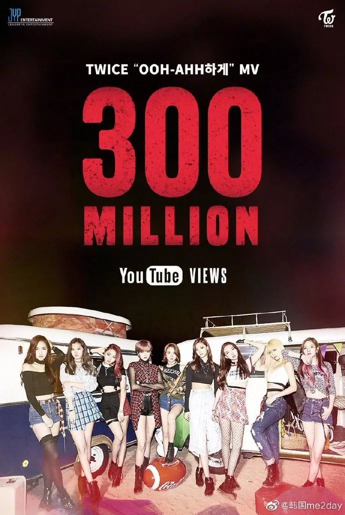 JYP公开TWICE出道曲《Like OOH-AHH》MV点击量破3亿庆祝海报
