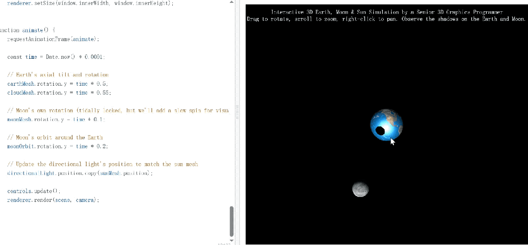 首先看Kimi,我感觉它这个光线做的就非常舒服,没有特别亮的地方,暗部也不全黑,能看见城市灯光。而且这个地球上的云层,不是贴上去的,这玩意可以实时移动位置,真的是在飘的!