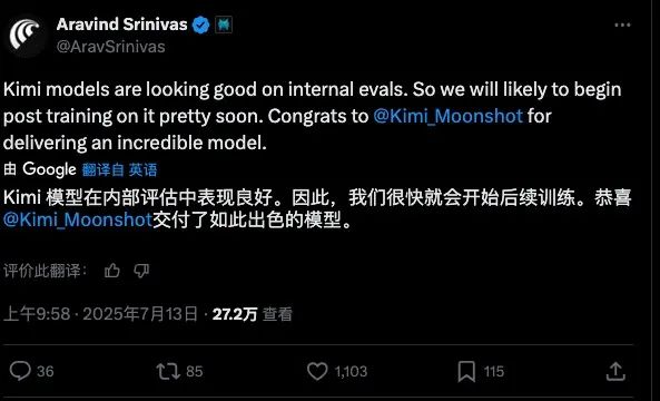 就连估值 150 亿美元的知名AI 搜索公司 Perplexity ,他家CEO,前 OpenAI 研究科学家 Aravind Srinivas,都在推上公开圈了月之暗面,希望他们Perplexity以后能基于 Kimi K2 进行训练。