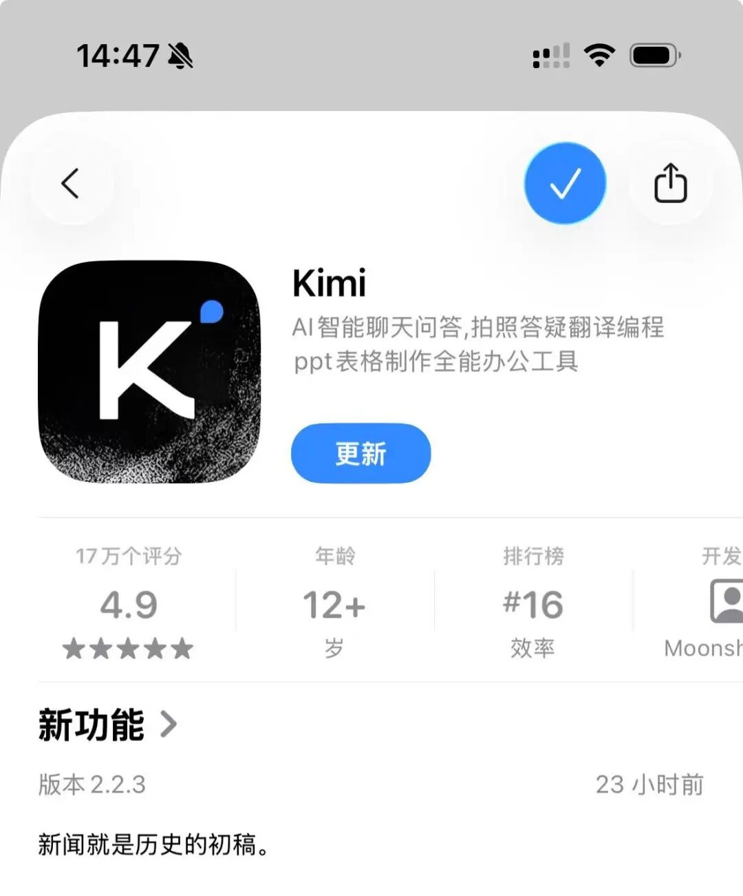 所以说有些时候,本事这玩意是很难藏着掖着的,你要真靠谱,想躲着不出名都难。比如新版Kimi app更新详情上,就很低调的只写了一句,新闻就是历史的初稿。
