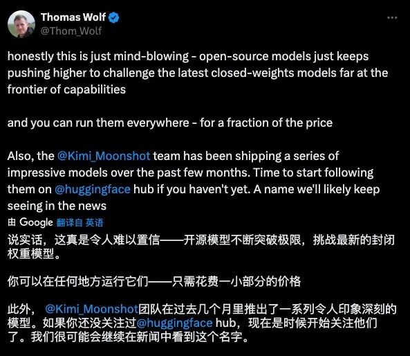 更牛逼的是,我还看到Hugging face 联合创始人Thomas Wolf,也对Kimi K2大加赞赏,说这简直难以置信,还向外国网友们安利了一波月之暗面团队。