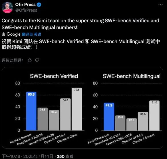 SWE-bench 榜单的作者Ofir Press,看到这成绩以后还专门发文点赞了Kimi团队。
