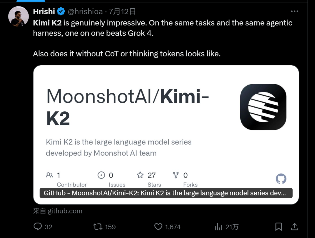 还有一家市值十亿美元,做AI应用的公司Greywing,创办人Hrishi Olickel 把它跟同样前几天发布的Grok4对比了一下,发现Kimi K2直接给Grok4干碎了。