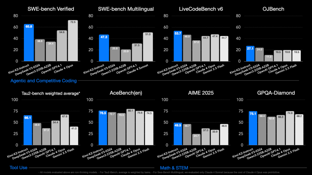 Kimi K2在代码、工具调用、数学、通用知识等性能测试中,表现都相当不错,一些项目甚至领先于顶尖的闭源模型。