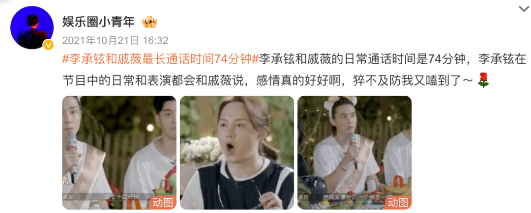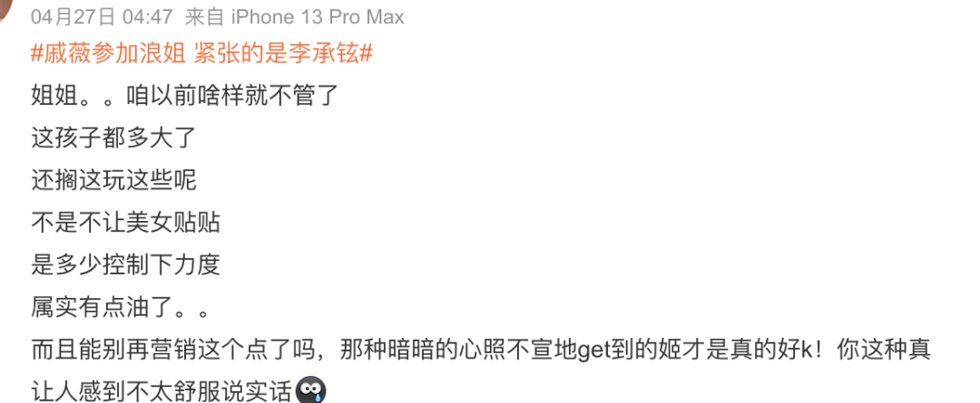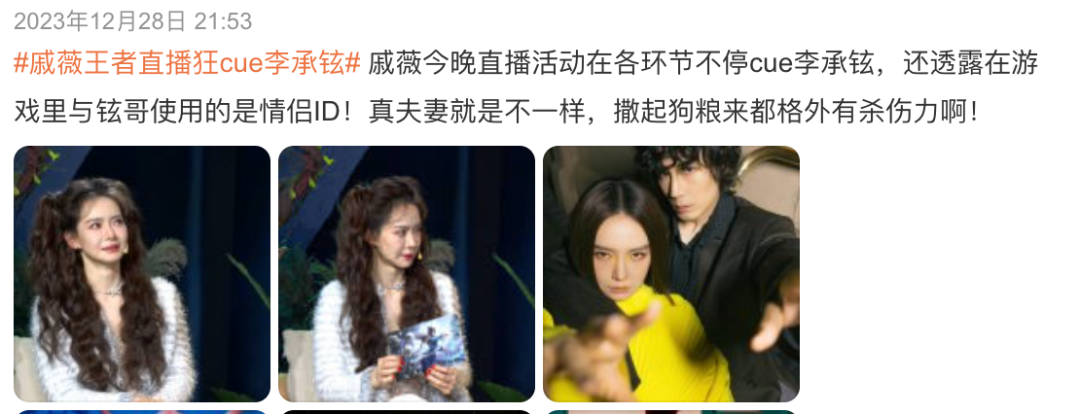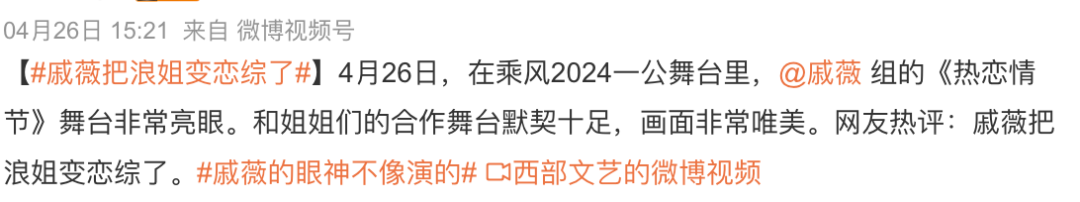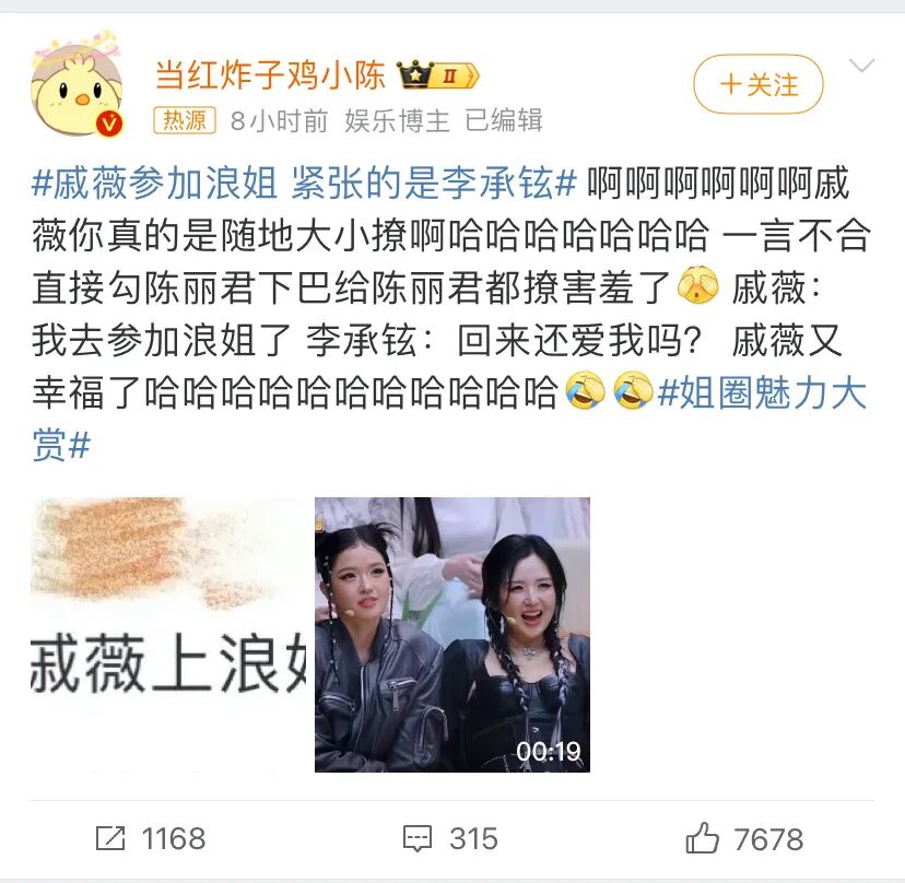 #戚薇的眼神不像演的#、#李承铉你老婆要有女朋友啰#、#戚薇把浪姐变成了恋综#、#戚薇参加浪姐 紧张的是李承铉#等热搜轮流轰炸▼▼▼