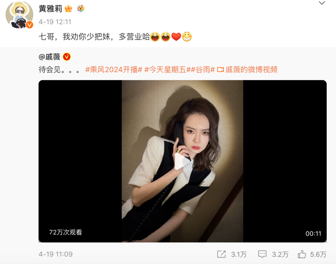 黄雅莉也要转发戚薇的微博,劝她少把妹▼▼▼