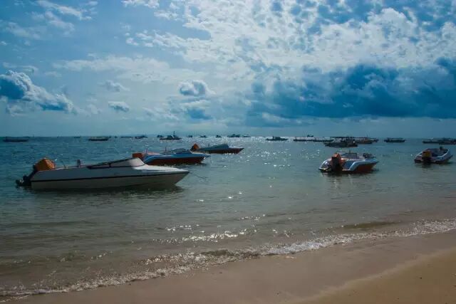 湛蓝色宝石般的海面与洁白柔软的沙滩描绘出柔和的海岸线,白色与蓝色完美的交合,光着脚踏上去,仿佛踩在云端又仿佛踏在水面。