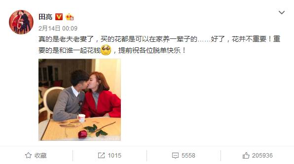 小狐发现从两天前的情人节开始,娱乐圈就频频虐狗!首先,田亮叶一茜这对,俩人掐着零点点晒了亲亲照~~