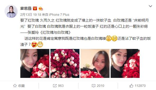 霍思燕晒出了嗯哼爸爸送的渐变色玫瑰花,还甜嗖嗖的贴上了张爱玲的文字~~