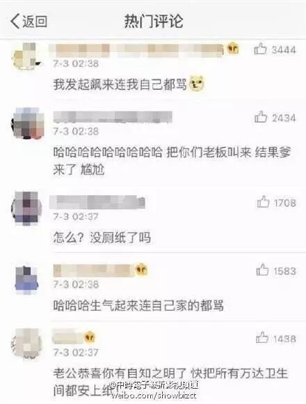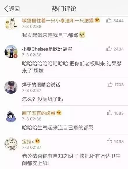 原来,王思聪在长沙录制《hello,女神》节目后下榻万达酒店,不知酒店哪方面令王公子雷霆震怒,3日凌晨思聪发微博痛骂:“cnmlgb,长沙万达文华酒店是我住过最sb的酒店了,还tm是自己家开的,绝了!”虽然他很快便删除了微博,但网友纷纷变身段子手调侃起来:“生起气来,连自己家都骂!”“思聪终于知道自家酒店厕所没纸了……”
