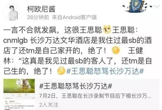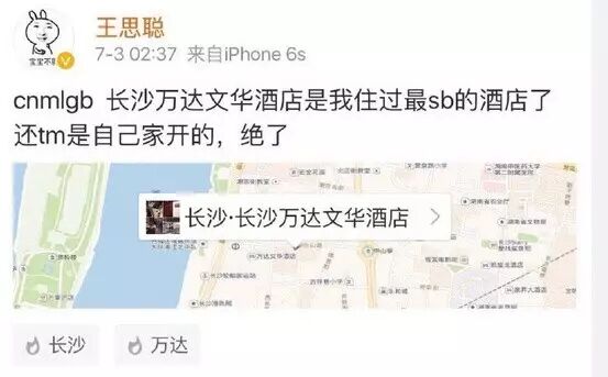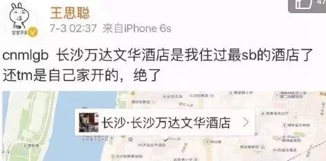 3日凌晨思聪发微博痛骂:“cnmlgb,长沙万达文华酒店是我住过最sb的酒店了,还tm是自己家开的,绝了!”