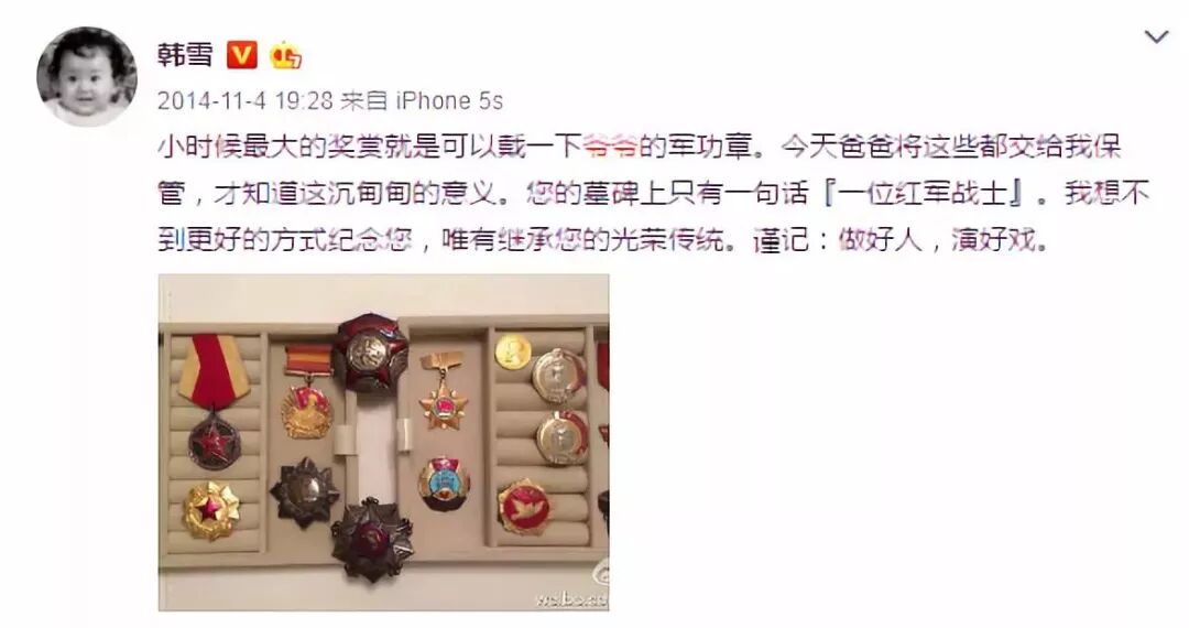 她本人也从不避讳谈到这一点,还曾在微博上大方晒过爷爷的军功章。