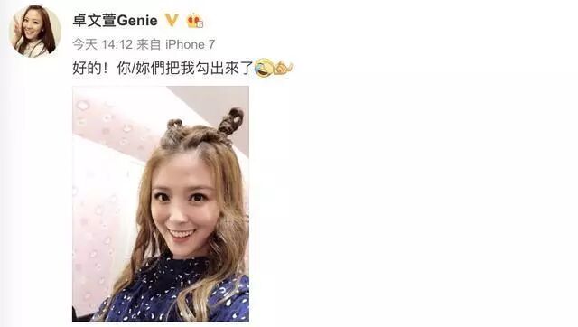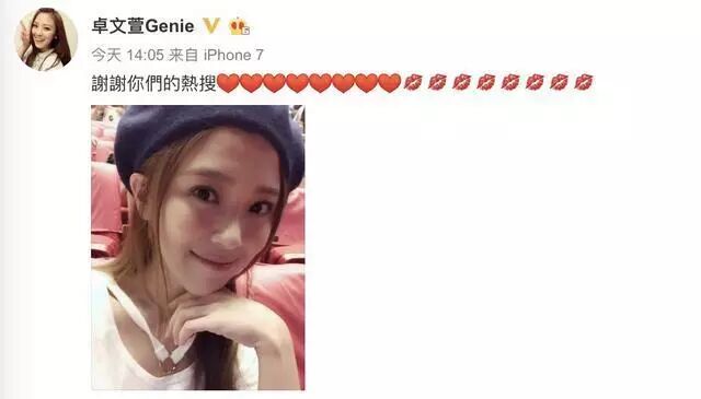 卓文萱长相甜美很有辨识度但是一直以来她都是坚持自己的音乐路线,这几年也很少有她的消息。因为看到微博网友关心她现在,还把她搜上了热搜,可爱的卓文萱立马在微博上晒了两张自拍感谢大家。