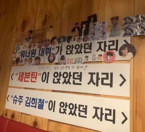 在SEVENTEEN坐过的位置上方,店主又标了一行字“珉奎,柾国,银优,有谦一起”