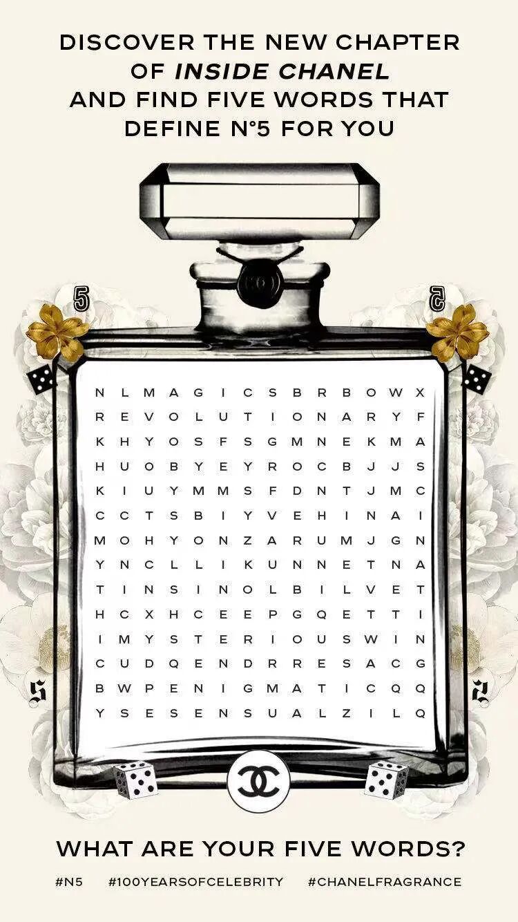 她是一场变革,是先锋派,是一则现代宣言,是一个谜,是一个神奇的数字“5”,是一个标志,如同实验室中的烧瓶,是一种象征,是一则现代神话,是20世纪的一个偶像,是一个隽永传奇,是一则寓言,关于现代性,她更是香水中的香水。