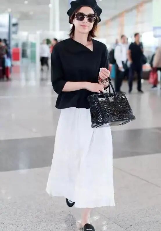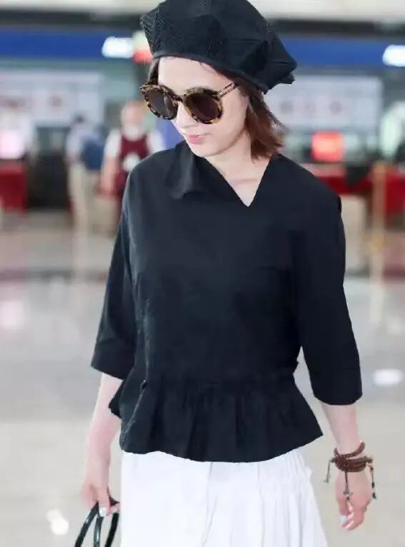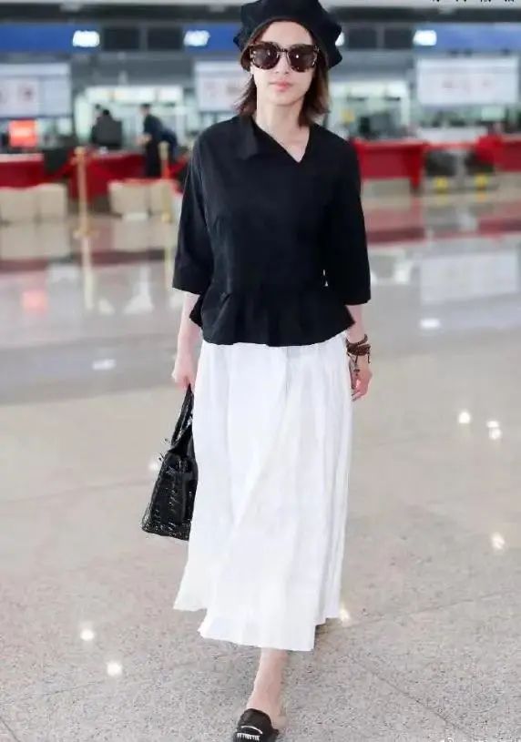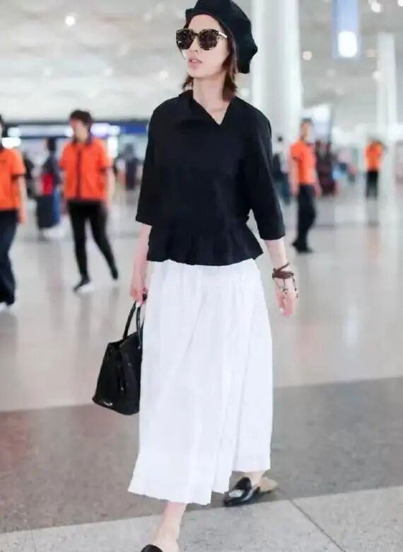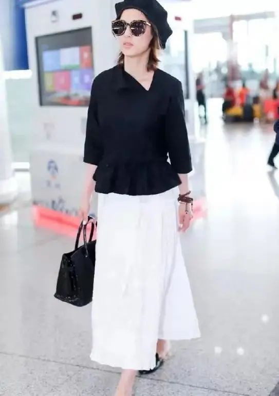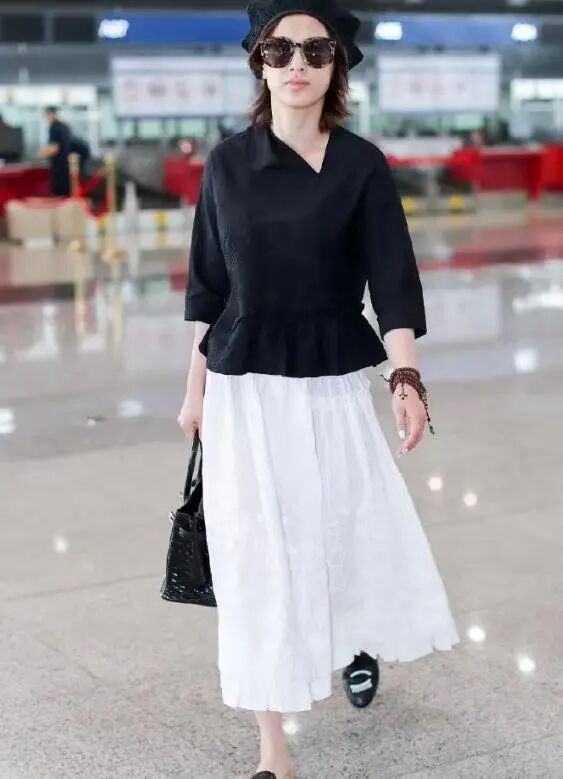 特别是那些身材有肉的女子,选择像黄圣依的黑色上衣作为上半身的色彩展现,这个是可以很好的修饰身材的。而且加上黑色的低调与沉闷,也可以突出稳重与大气的感觉,而把与之对立的白色半身裙放在了下半身,带来的视觉冲击力也是很强烈的。宽松的版型也是很显瘦,而且对那些腿部肥胖的MM们,也是具有很好的修饰效果,打造出造型的层次感也很容易。