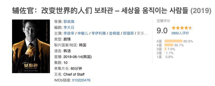 上个月,申敏儿和李政宰主演的《辅佐官》,豆瓣评分高达9.0。