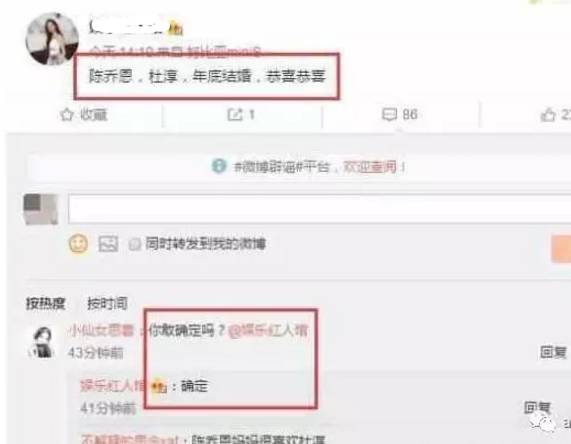 一当红博主爆猛料,说陈乔恩和杜淳即将在年底结婚,引来不少网友围观,纷纷送上祝福,也有提问博主“你敢确定吗?”博主明确回答“确定”。看来这事是有八九是要成真啦!