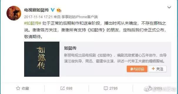 当晚,《如懿传》制片人黄澜发微博称:“万事都会顺遂,不用听信谣言”否认此传闻,并表示好剧值得等待。
