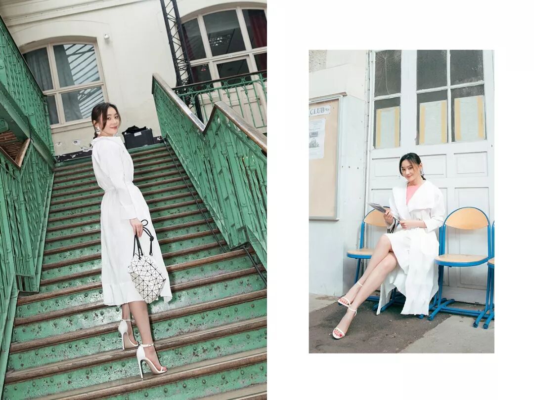 身穿Issey Miyake白色连衣裙,