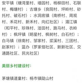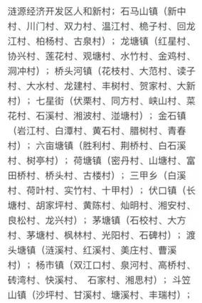 集里街道道吾村;关口街道道源湖村;大围山镇(中岳村、楚东村);永安镇水山村;北盛镇亚洲湖村;中和镇长安村;大瑶镇天和社区;小河乡新河村;葛家镇金源村;枨冲镇橙冲社区;洞阳镇洞阳社区;普迹镇书院新村;张坊镇上洪社区;社港镇淮洲村;镇头镇干口村;永和镇佳成村