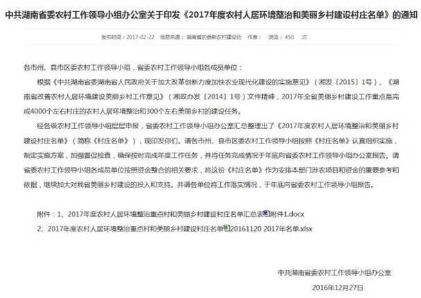 近日,中共湖南省委农村工作领导小组办公室印发了关于《2017年度农村人居环境整治和美丽乡村建设村庄名单》的通知。(以下简称《通知》)
