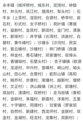 油麻镇(五陵村、长湖村、玉兰村);悦来镇(尹家村、胡家村);马田镇(上桥村、明星村、和平村、大坡村、寨下村);洋塘乡景星村;高亭司镇(承上村、黄里村);便江镇(石塘村、南塘村、白头狮村);柏林镇(虹桥村、大洞村);鲤鱼塘镇(樟田村、申明亭村);大布江乡深洞村;龙形市乡(石阳村、高石村);太和镇桐木村;樟树镇天堂村;金龟镇小田村;黄泥镇泉田村;七甲乡四甲村